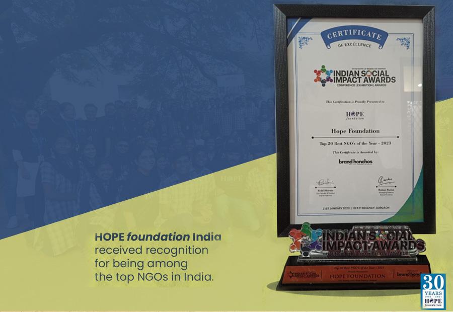 HOPE foundation India received recognition for being among the top NGOs in the country at the Indian Social Impact Awards Summit 2023*.